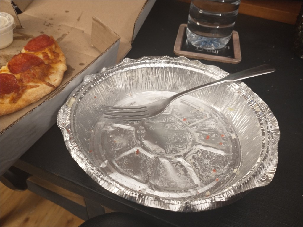 My recollection: Okay, I’m cheating here and consulting last year’s agenda and journal… No trace of the meal in either place. Okay, I think we’ll just write this up as a “depression salad” and leave it at that. For what it’s worth, I’d still order an Atlas Pizza salad today, so if that’s indeed where this one’s from, that bodes well…